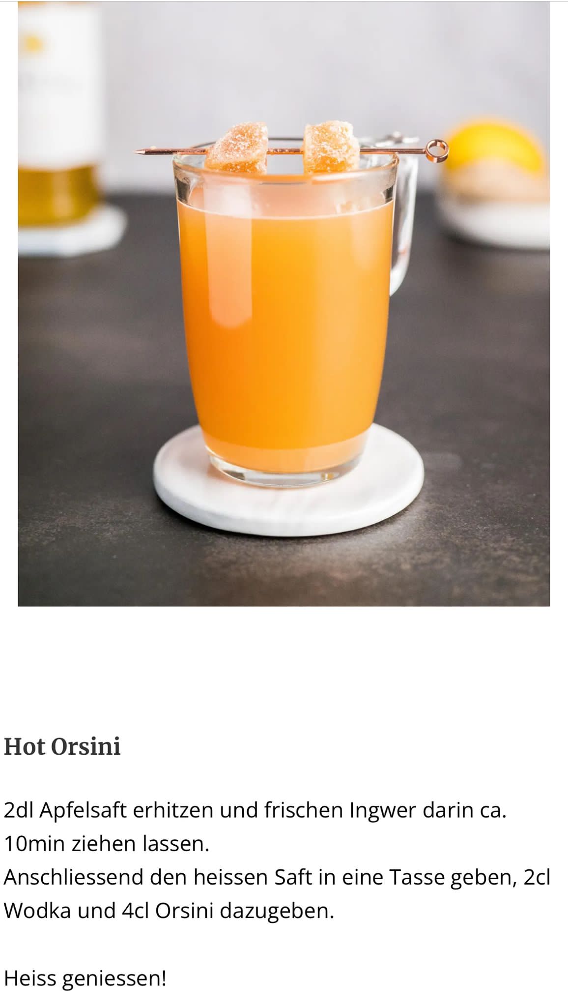 Seit gut einem Jahr steht die Flasche bei euch auf der Küchenablage, heute wird sie zum ersten Mal gebraucht - der Orsini. Macht doch einen Hot Orsini nach dem Rezept, sodass wir uns heute Abend beim Raclette die Hände wärmen können. Ausnahmsweise heute ohne Aufgabe.